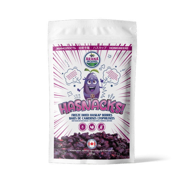 Our Freeze Dried Haskap Berries, known as Hasnacks, capture all the bright, tangy flavour of fresh haskaps in a crisp and convenient snack. Made with no added sugar and just 25 calories per serving, they offer a wholesome way to enjoy nutrient-rich berries anytime.